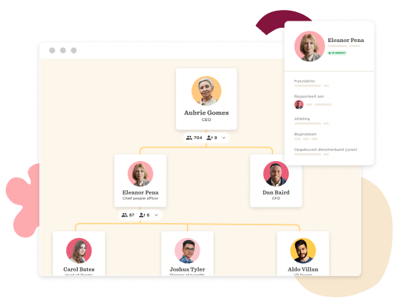 Wil je de hiërarchie van het bedrijf bekijken?Bobs organogram laat zien hoe mensen, teams en afdelingen zich tot elkaar verhouden. Je kunt ook je eigen aangepaste organogram maken met meerdere gegevenslagen.