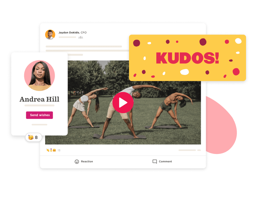 Finally, use the homepage to welcome new joiners or share announcements by posting Shoutouts. Or, use Kudos to recognize an employee or team achievement. Plus, just like your favorite social platforms, employees can react with emojis and comments.