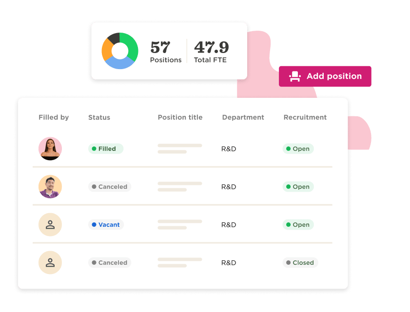 Build a single view of your positions—both current and planned—and add, edit, postpone, or cancel positions as your plans evolve and change. Give your managers access to view open positions for their teams and request new positions as needed. Stay on track by creating timelines and hiring plans for your recruitment team. It’s simple.