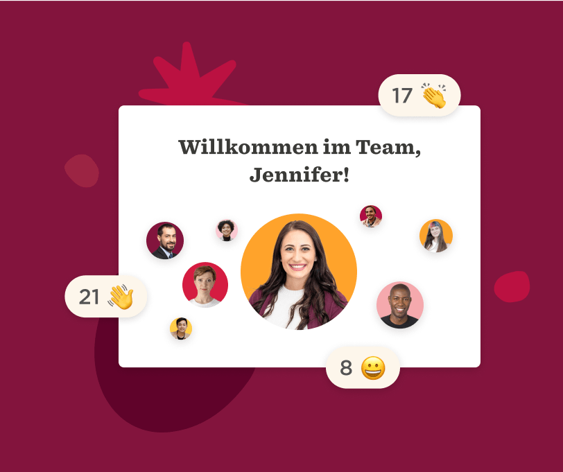 Poste ein Foto und teile spannende Informationen mit anderen Teammitgliedern. Wenn du neue Teammitglieder öffentlich willkommen heißt, gibst du ihnen ein Gefühl der Zugehörigkeit und hilfst ihnen, in deinem Unternehmen neue Kontakte zu knüpfen. Mache Ankündigungen zu einem festen Teil deines Einarbeitungsprozesses, um sicherzugehen, dass alle neuen Mitarbeitenden angemessen begrüßt werden. Die Ankündigungen von Bob können in Slack und Microsoft Teams integriert werden. Dadurch gliedern sie sich direkt in die Arbeitsabläufe deiner Teammitglieder ein und alle werden über Neueinstellungen informiert.