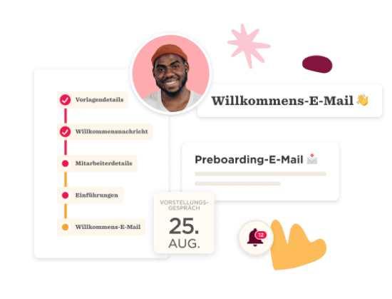 Ja. Bob bietet dir flexible Workflows, die Aufgaben für unterschiedliche Beteiligte über das gesamte Unternehmen hinweg enthalten können – beispielsweise die Personal-, IT- und Finanzabteilung oder Vorgesetzte. Aufgaben können personalisiert und so konfiguriert werden, dass sie E-Mails, Kalendereinladungen, Slack- oder Teams-Nachrichten senden. Sorge dafür, dass deine neuen Teammitglieder mit einem personalisierten Onboarding-Prozess optimal vorbereitet werden.
